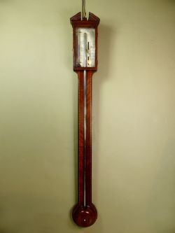 The pediment top with a brass vase finial, above a silvered dial, with barometric gauge, thermometer, and sliding cursor. The dial held behind a hinged glazed door.